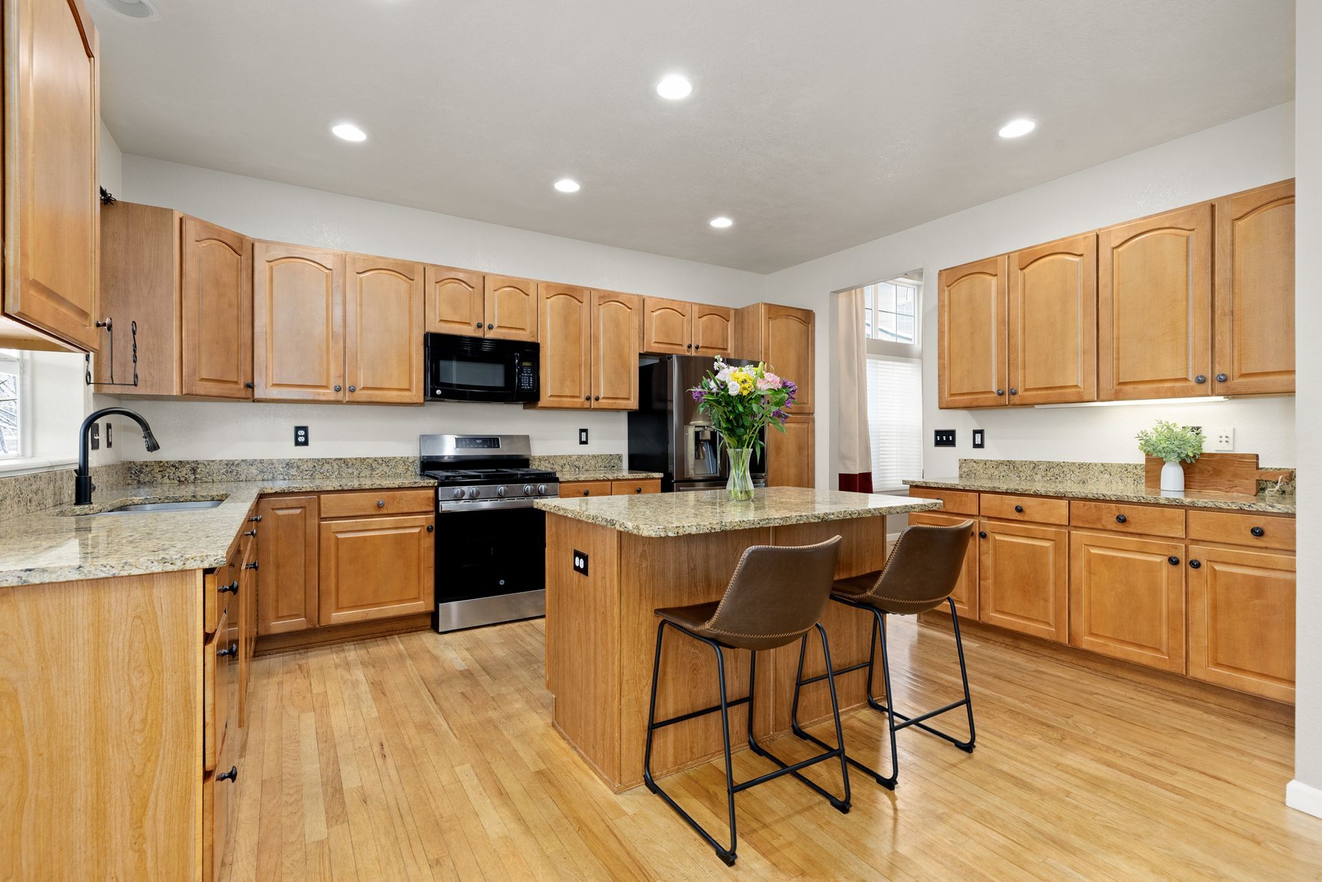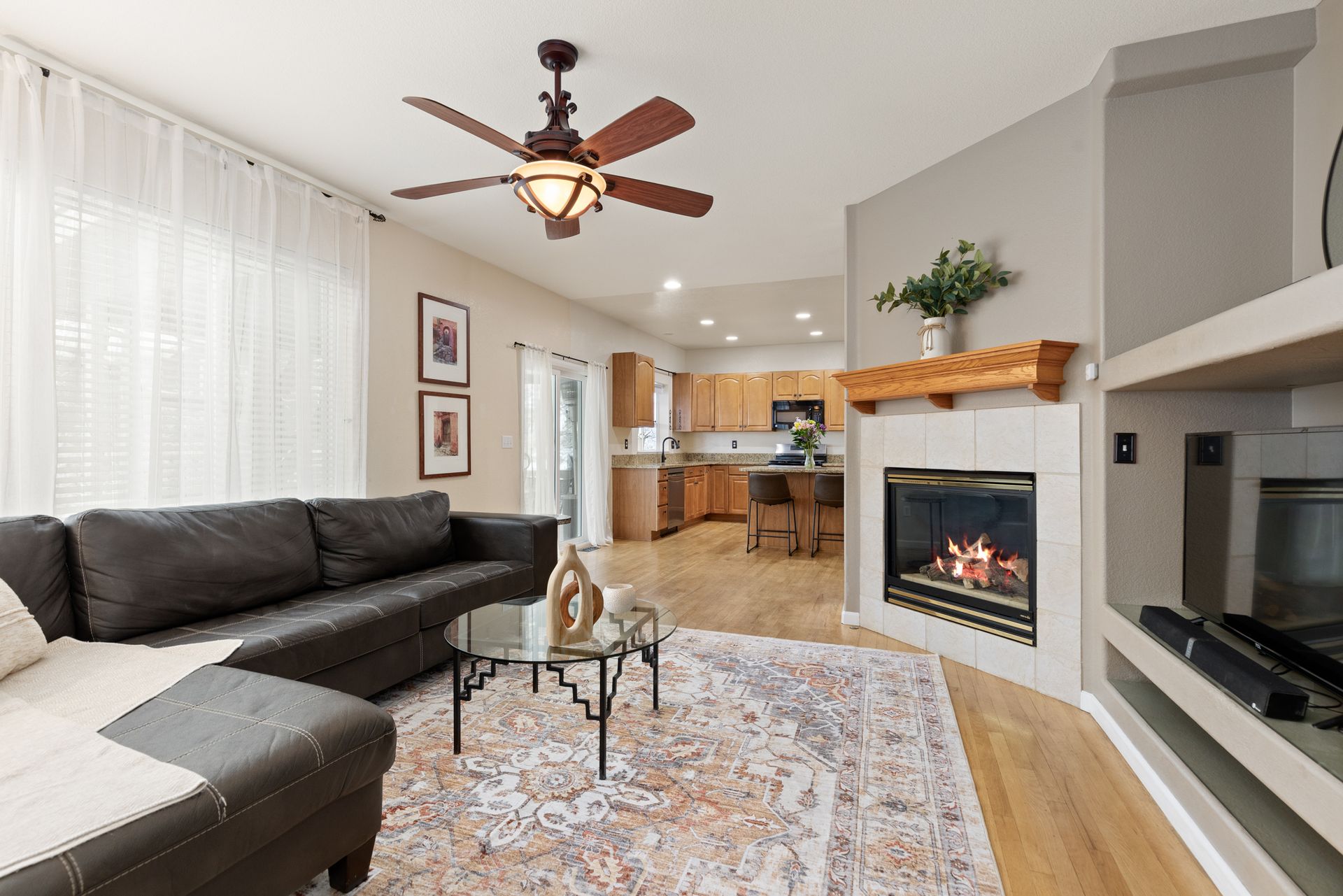 Inside, you’ll find 4 bedrooms, 4 bathrooms, and a dedicated home office across 3,637 square feet of comfortable living space. The open main floor layout creates a seamless flow between the kitchen, dining, and living areas, centered around a cozy fireplace that adds warmth and character to the main gathering space.